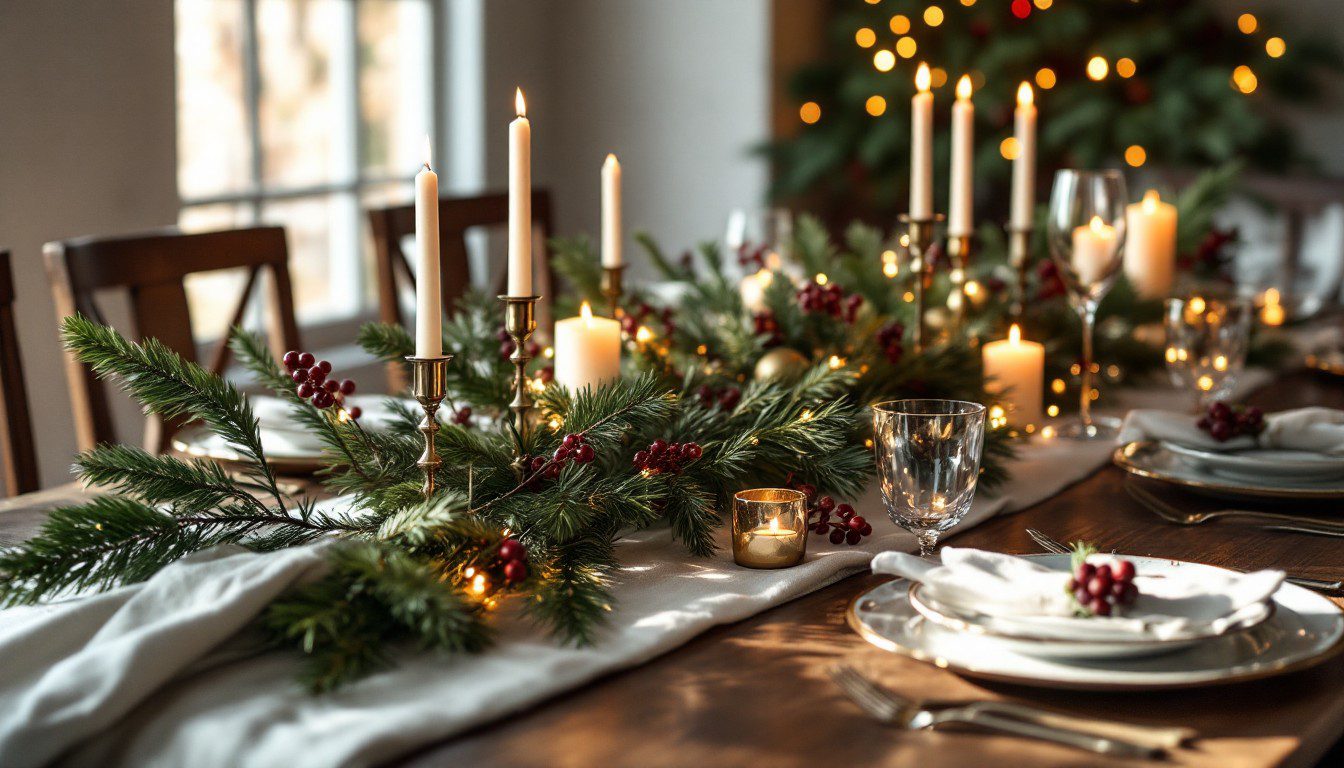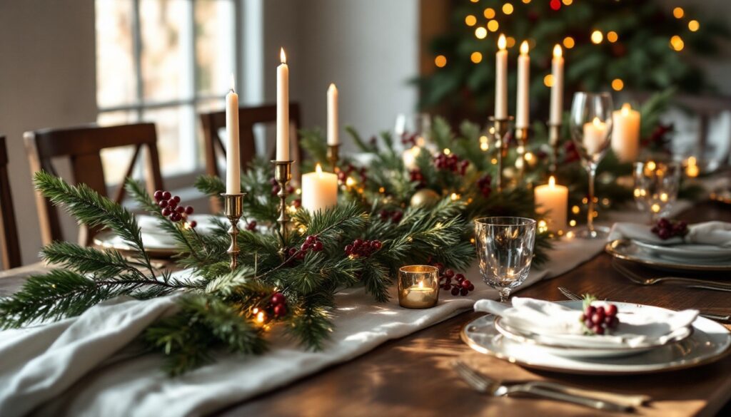 Nestle your candles safely among the greenery, add a few ornaments or brass touches, and your entire table suddenly feels layered, thoughtful, and full of life — without worrying about dried needles or a tablecloth ruined on Christmas Eve.