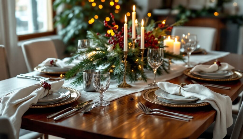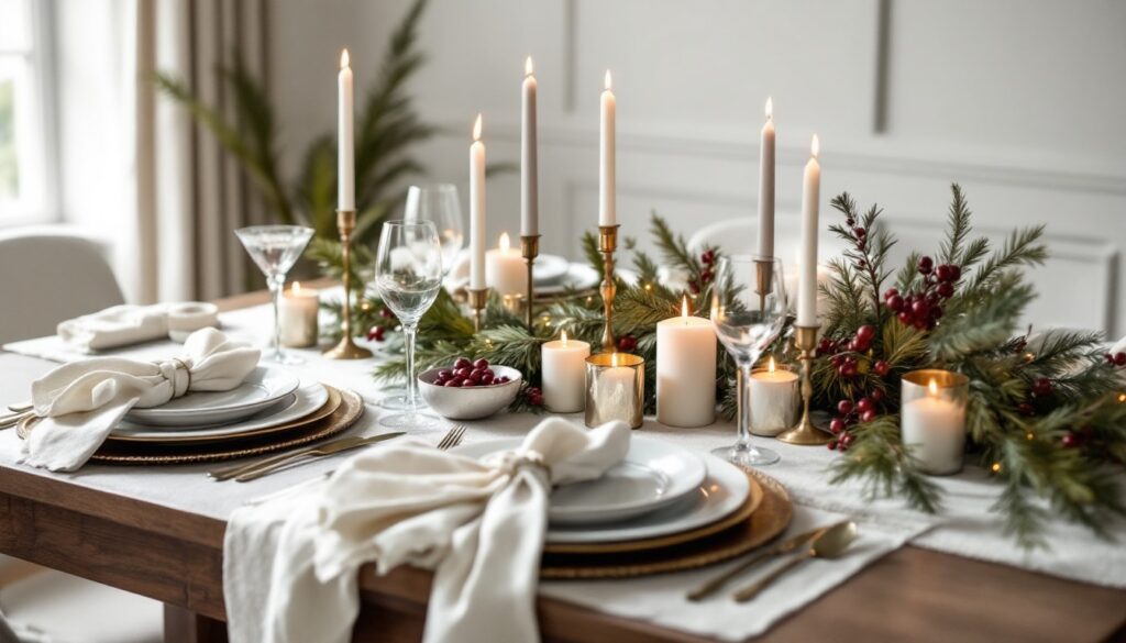 Think cedar, eucalyptus, ivory napkins, warm brass candlesticks, and natural wood chargers. This palette is effortless and calming — perfect for a traditional Christmas table.