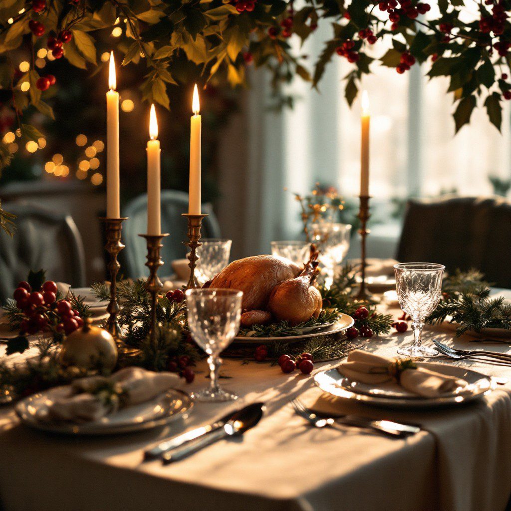 Layer white linens with gold accents, delicate crystal glassware, and soft candlelight. A beautiful option if you prefer a clean, airy holiday look.