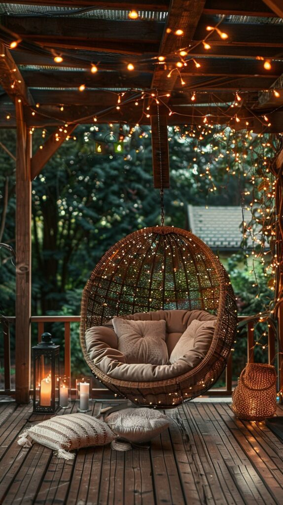 • Lighting: Hang a wicker pendant above the dining area, string fairy lights across beams, and add lanterns for ambient glow.