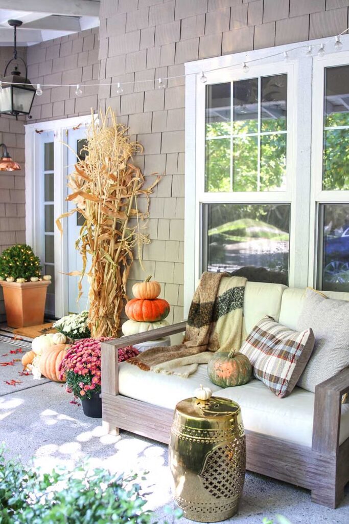 • Seating: Swap wicker for wood or metal with weather-resistant cushions. Add flannel or plaid pillows for that classic fall feel.